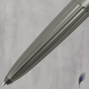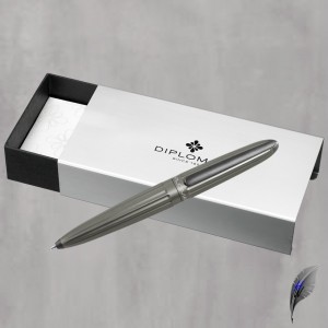 Exklusiver Tintenroller aus der Diplomat Aero Kollektion, Aluminiumgehäuse mit grau eloxierter Oberfläche, stromlinienförmiges Design, Kappe mit exklusivem Schließsystem "Soft sliding click", Zierteile in dunkel mattchrom, schwarze Diplomat Tintenrollermine, mit Präsentetui
