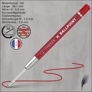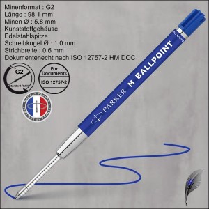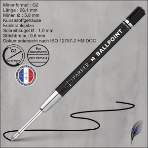 Parker Quinkflow Kugelschreiberminen, Großraumminen im internationalen G2-Format, hochwertige Quinkflow Kugelschreiber-Technologie, garantiert schnelles Trocknen und ein klares Schriftbild, dokumentenecht nach ISO 12757-2, 3 Strichbreiten, erhältlich in schwarz und blau