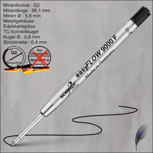 Schmidt Kugelschreibermine P900, Großraummine im internationalen G2-Format, Metallgehäuse mit Edelstahlspitze, TC-Schreibkugel, dokumentenecht nach ISO 12757-2, erhältlich in 3 Strichbreiten und 4 Farben