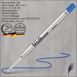 Die Waldmann Kugelschreiberminen sind in den Farben Blau und Schwarz in der Strichbreite M ( mittel ) lieferbar.
